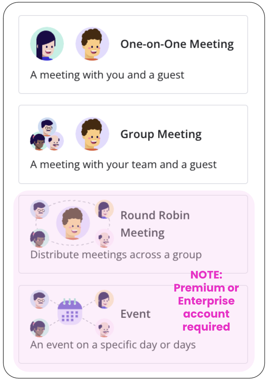Round Robin Meetings: Commonly used when you want a guest to meet with any one from a group of your teammates (used to distribute inbound calls across sales teams, round robin recruiter screens at job fairs, make it easy for customers to schedule time with any member of a large support team). NOTE: Premium or Enterprise account required.