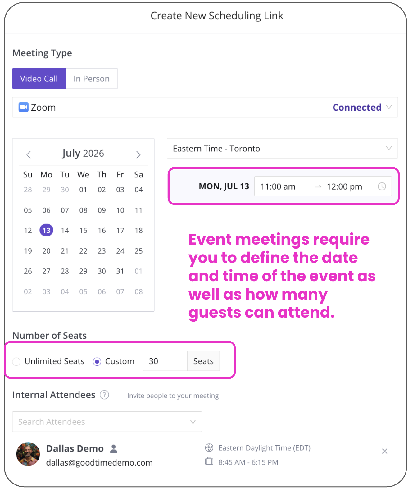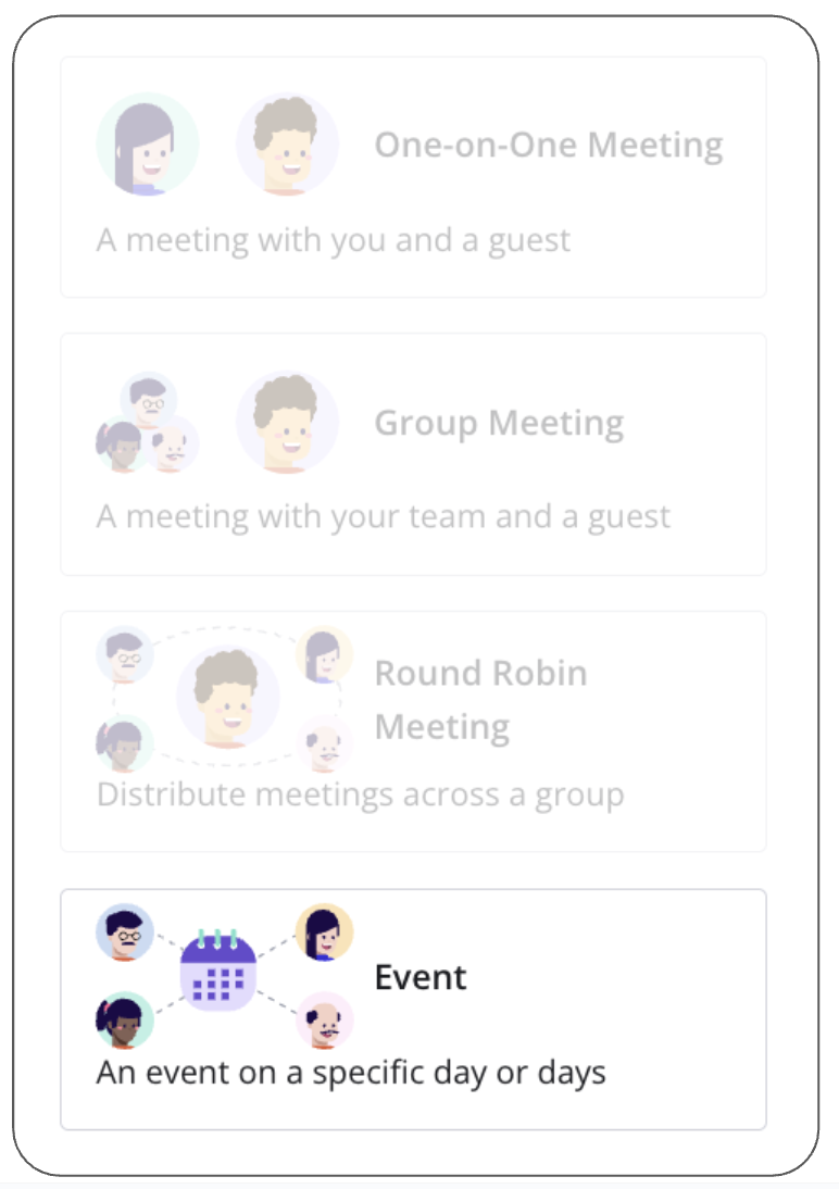 The Event meeting link is most commonly used when you need to share a specific time window with one or more guests. There links can be useful for events such as Career Fairs, Post Webinars Meetings, Investor Weeks, etc.